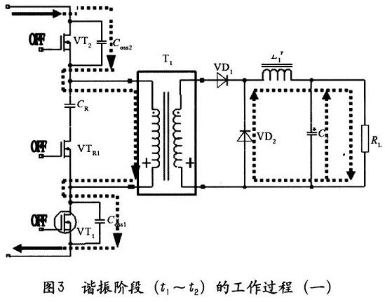 2)諧振階段(t1~t2),如圖3所示,在占空比的控制下,第一主開(kāi)關(guān)管VT1和第二主開(kāi)關(guān)管VT2在t1時(shí)刻同時(shí)關(guān)斷,變壓器磁芯極性反轉(zhuǎn)。因輸入電源和變壓器的勵(lì)磁電感的作用給VT1和VT2的寄生電容COSS1,COSS2充電,由于電容電壓不能突變,第一主開(kāi)關(guān)管VT1和第二主開(kāi)關(guān)管VT2在ZVS狀態(tài)下關(guān)斷。同時(shí)變壓器的勵(lì)磁電流開(kāi)始給鉗位開(kāi)關(guān)管VTR1的寄生電容COSS放電,經(jīng)VTR1的體二極管給鉗位電容CR1充電。次級(jí)VD1截止,VD2導(dǎo)通,L1經(jīng)過(guò)VD2續(xù)流繼續(xù)給負(fù)載RL供電。