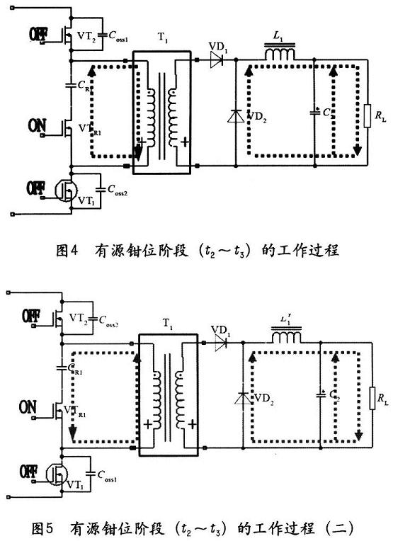 3)有源鉗位階段(t2~t3),如圖4和圖5所示,在亡2時(shí)刻鉗位開(kāi)關(guān)管VTR在ZVS狀態(tài)下開(kāi)啟,由于VTR1的體二極管先前已開(kāi)通,VTRl的UDS電壓很低。鉗位開(kāi)關(guān)管VTR1在整個(gè)階段處于開(kāi)通狀態(tài),變壓器勵(lì)磁電流經(jīng)過(guò)鉗位開(kāi)關(guān)管VTR1繼續(xù)給鉗位電容CR1充電,鉗位電容CR1充滿(mǎn)以后經(jīng)變壓器勵(lì)磁電感放電。次級(jí)在整個(gè)階段由L1續(xù)流經(jīng)VD2給負(fù)載供電,VD1截止。