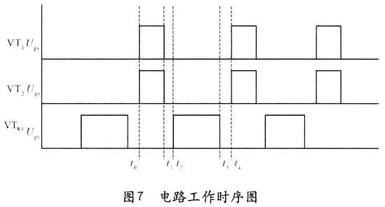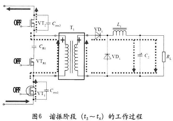 4)諧振階段(t2~t4),如圖6所示,t3時(shí)刻鉗位開(kāi)關(guān)管VTR1在ZVS狀態(tài)下關(guān)斷(VTR1的寄生電容使電壓不能突變),由于變壓器初級(jí)電流仍然反向流動(dòng),磁芯極性反轉(zhuǎn),使第一主開(kāi)關(guān)管VT1和第二主開(kāi)關(guān)管VT2的寄生電容COSS放電,在t3后VD1導(dǎo)通,VD2截止;然后其主開(kāi)關(guān)管的體二極管導(dǎo)通把能量全部送回輸入電源與負(fù)載,變壓器磁芯完成磁復(fù)位。此時(shí)主開(kāi)關(guān)管VT1和VT2的UDS電壓為零,t4時(shí)刻同時(shí)開(kāi)啟第一主開(kāi)關(guān)管VT1和第二主開(kāi)關(guān)管VT2做到ZVS導(dǎo)通。在t4完成后,開(kāi)關(guān)周期又返回到t0~t1的狀態(tài)。