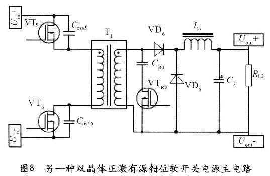 雙晶正激有源鉗位軟開(kāi)關(guān)電源還有另一種結(jié)構(gòu),如圖8所示。其結(jié)構(gòu)與圖1所示的雙晶正激有源鉗位軟開(kāi)關(guān)電源基本相似,只鉗位開(kāi)關(guān)管VTR3以及鉗位電容CR3設(shè)置在副邊,鉗位電容CR3一端與變壓器的同名端相連,另一端與鉗位開(kāi)關(guān)管VTR3的D極相連,鉗位開(kāi)關(guān)管VTR3的S極與變壓器的異名端相連,請(qǐng)參閱圖8。其工作原理同在初級(jí)鉗位相差不多,這里不再講述。