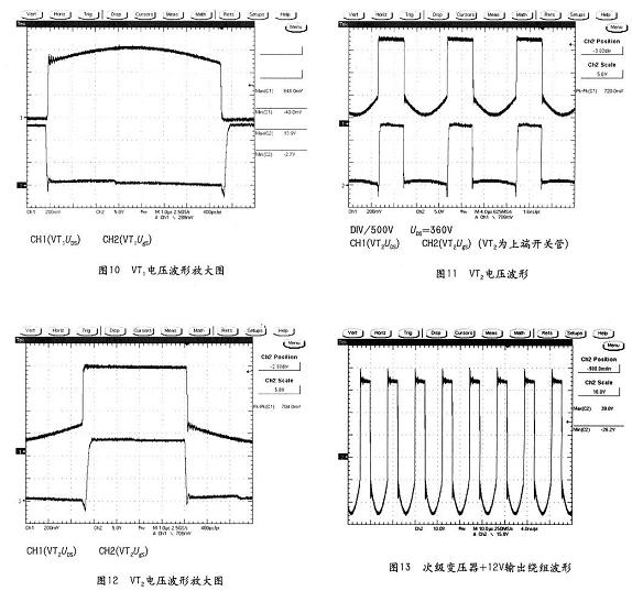 實(shí)際波形結(jié)果我們實(shí)際用一般雙晶體管正激的產(chǎn)品經(jīng)過(guò)改進(jìn),將其調(diào)整為上述的有源鉗位方式,其實(shí)際的雙晶體管工作波形如圖9~圖12所示。