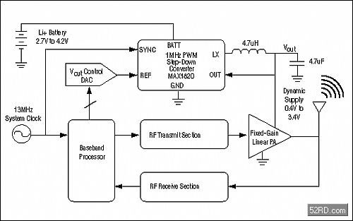 圖1.開關調(diào)節(jié)器(MAX1820)動態(tài)調(diào)節(jié)W-CDMA功率放大器(PA)的電源。通過對功放電源的高效調(diào)節(jié),極大地降低了能量的消耗,延長了手機電池的使用時間。