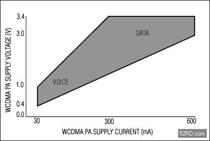 圖2.固定增益的雙極型W-CDMA功率放大器的典型負載曲線中有一個明顯的阻性成分。電源電壓和電流會從最低的0.4V/30mA(12mW)變化到最高的3.4V/600mA(2040mW),話音的發(fā)送一般在1.5V/150mA(225mW)下進行,高速數(shù)據(jù)的發(fā)送一般在2.5V/400mA(1000mW)下進行。