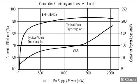 在很寬的負載范圍內(nèi)具有高效率—沒有高效率,采用開關型調(diào)節(jié)器就失去了意義,因此,高效率和省電是MAX1820的主導設計思想(見圖3)。傳送數(shù)據(jù)時(約500mW至2040mW),MAX1820內(nèi)部的低導通電阻(0.15Ω)PFET功率開關可以提供高達93%的效率。傳送話音時(約12mW至500mW),MAX1820內(nèi)部的0.2ΩNFET同步整流器和3.3mA的低工作電流(強制PWM模式)使轉(zhuǎn)換效率達到85%。85%的效率聽起來不算太高,但對于一個工作在1MHz恒定開關頻率和很輕負載的轉(zhuǎn)換器來講確非易事,正如圖3所示,轉(zhuǎn)換器具有極低的功率損耗。這要歸功于優(yōu)秀的設計和亞微米工藝的采用,這種工藝能夠在給定的FET導通電阻下獲得更低的柵極電容。