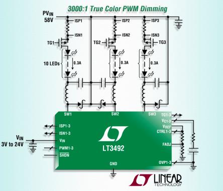 凌力爾特公司 (Linear Technology Corporation) 推出 2.1MHz DC/DC 轉(zhuǎn)換器 LT3492,該器件為作為 3 通道恒定電流 LED 驅(qū)動器工作而設(shè)計(jì)。LT3492 的 3 個通道中每一個都可以驅(qū)動多達(dá) 10 個 300mA 的串聯(lián) LED,從而使它能夠以高達(dá) 96% 的效率驅(qū)動多達(dá) 30 個 300mA LED。所有 3 個通道都由一個獨(dú)立的 True Color PWM™ 信號控制,從而使每個通道都能獨(dú)立調(diào)光至高達(dá) 3000:1 的調(diào)光比。固定頻率、電流模式架構(gòu)確保在寬的電源和輸出電壓范圍內(nèi)穩(wěn)定工作。頻率調(diào)節(jié)引腳使用戶能夠在 330kHz 至 2.1MHz 范圍內(nèi)設(shè)定頻率,以優(yōu)化效率,同時最大限度地減小外部組件尺寸。LT3492 的耐熱增強(qiáng)型 4mm x 5mm QFN (或耐熱增強(qiáng)型 TSSOP) 封裝為高達(dá) 50W LED 應(yīng)用提供一個占板面積高度緊湊的解決方案。