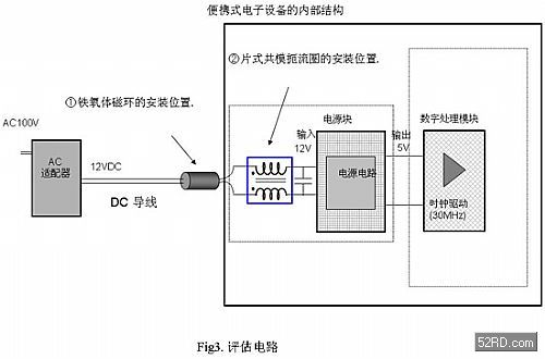 為了評估DC電源線上的EMI靜噪濾波器的噪聲抑制效果,我們做了一個(gè)模擬便攜式設(shè)備的評估電路板(如圖3所示)。它是通過AC適配器取得DC電源,同時(shí)配備了一個(gè)類似于電源功能塊的DC/DC轉(zhuǎn)換器電路,并安置了一個(gè)類似于內(nèi)部數(shù)字處理電路的時(shí)鐘動(dòng)作電路。