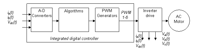 圖 1 是通用數(shù)字馬達(dá)控制系統(tǒng)的結(jié)構(gòu)簡(jiǎn)圖。算法可在數(shù)字控制器上實(shí)施,數(shù)字控制器生成的控制輸出可通過逆變器驅(qū)動(dòng)馬達(dá)。電流及電壓測(cè)量等反饋信號(hào)通過模數(shù)轉(zhuǎn)換器 (ADC) 反饋至該算法。
