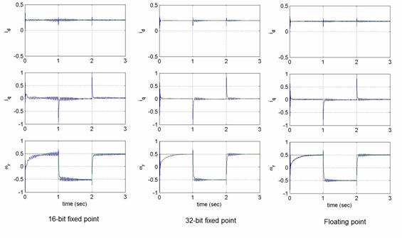 要比較三種數(shù)據(jù)格式對(duì)數(shù)值精度的影響,需要監(jiān)控估計(jì)速度響應(yīng)與相應(yīng)的d 及q 軸參考電流。將所有的PI 增益、參數(shù)、基本量在全部三種數(shù)據(jù)格式的仿真過程中設(shè)定為相同的有效值。從圖4 可以看出,16位定點(diǎn)版本與浮點(diǎn)版本的性能具有極大的差別。