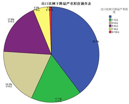 [page](二)出口下降最嚴(yán)重程度5-6成者比重最大,目前為止基本上已大部分恢復(fù)金融風(fēng)暴,全球經(jīng)濟(jì)重創(chuàng),對出口為主的企業(yè)影響最為慘重,尤其是對于以出口為導(dǎo)向的我國行業(yè)企業(yè),損失慘重。數(shù)據(jù)顯示,受金融危機(jī)影響,出口比例下降最嚴(yán)重程度5-6成者比重最大,占17.8%,下降1-2成者比例也不低,占17.1%(如下圖:出口比例下降最嚴(yán)重程度調(diào)查表。備注:藍(lán)色部分39.7%比例為單一內(nèi)銷型企業(yè))。