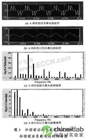 為了驗證上述諧波檢測和控制方案的有效性以及由此構(gòu)成的基于DSP的并聯(lián)型有源電力濾波器是否能很好地補償諧波和無功電流,本文進行了實驗。采用阻性負載作為三相不控橋式整流器的負載,試驗中在負載側(cè)接了1個2Ω的電阻。下面以A相為例給出實驗波形。圖4分別給出了補償前后的負載電流波形和補償前后負載電流的頻譜圖。