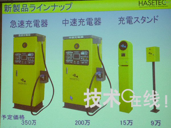 “快速充電器在電動汽車的普及中不可或缺。作為最先開發(fā)出快速充電器的企業(yè),我們將繼續(xù)積極努力”,Hasetec代表董事社長千村正如此表示。該公司日前擴(kuò)充了電動汽車用充電器的產(chǎn)品陣容。除改進(jìn)了原來的快速充電器外,還新開發(fā)出了一款中速充電器和兩種充電站。價格方面,快速充電器為350萬日元,中速充電器為200萬日元,充電站分別為15萬日元和9萬日元。