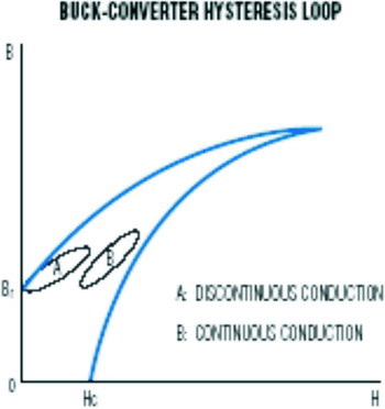 磁芯損耗主要是由于磁滯現(xiàn)象以及磁芯內(nèi)部傳導(dǎo)率或其他非線性參數(shù)的互感產(chǎn)生。在Buck拓?fù)浣Y(jié)構(gòu)中,第一象限的B-H磁滯回線對磁芯損耗影響最大。在第一象限這個局部圖中,磁滯回線顯示了電感從初始電感量過渡到峰值電感量再回到初始電感量的過程。如果開關(guān)電源穩(wěn)定工作在不連續(xù)狀態(tài),磁滯回線會從剩余電感量(Br)過渡到峰值電感量(參考圖1)。如果開關(guān)電源工作在連續(xù)狀態(tài),那么磁滯回線將會從直流偏置點上升到曲線峰值,再回到直流偏置點。通過實驗可以確定磁滯回線的精確曲線形狀(基本上是橢圓曲線)。