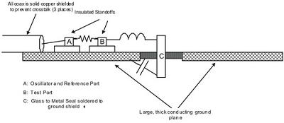 測試電感性能的最有效方法就是將被測試電感放置在最終開關(guān)電源電路上,然后對此電路的效率進(jìn)行測量。但是,這種測試方法需要有最終電路,不易采用?,F(xiàn)在,有一種相對簡單的測試方法,可以在設(shè)計開關(guān)電源前對電感的磁芯損耗進(jìn)行測試(在其設(shè)定的開關(guān)頻點上)。首先,將磁芯串連放置在低損耗電容介質(zhì)上(比如鍍銀云母)。然后,用一系列共振模驅(qū)動。其中介質(zhì)的電容值需要與被測電感的開關(guān)頻率一致。最后采用網(wǎng)絡(luò)分析儀來完成整個測試過程(信號發(fā)生器加上一個射頻伏特計或者功率計也可以完成測試)。測試設(shè)備的結(jié)構(gòu)如圖2所示