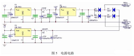 電源部分輸入220V、50Hz 交流電,輸出全機所需的三種電壓:+5V、+15V、-5V,主要供數(shù)控部分和D/A 轉(zhuǎn)換芯片使用;+15V 作為運放的正電源,同時也是穩(wěn)壓輸出電路的主電源。該電源模塊部分拓展了-5V 負(fù)電壓,同時作為運放的負(fù)電源,如圖5 所示。