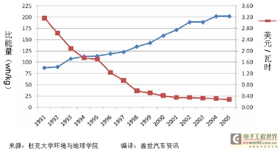 隨著全球尤其亞洲地區(qū)(以日本為主)的傳統(tǒng)或非傳統(tǒng)的電池企業(yè)都紛紛加大對(duì)車用鋰電池的投資,并增加量產(chǎn)規(guī)模,鋰電池的價(jià)格已經(jīng)呈逐年下降趨勢(shì)。(見(jiàn)圖1)