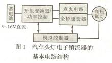 為了滿(mǎn)足燈在啟動(dòng)與穩(wěn)態(tài)時(shí)的不同要求,目前,一般采用的汽車(chē)頭燈用電子鎮(zhèn)流器的基本電路結(jié)構(gòu)包含圖1所示的4部分功能。