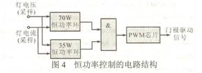 由圖3可知,全橋逆變電路的總體負(fù)載只有燈消耗有功功率,因此燈消耗的功率可近似看作是逆變器的輸入功率。所以通過(guò)不斷采樣燈回路上的輸出電壓Uo和輸出電流Io,采用拋物線(xiàn)近似的恒功率控制方法,用模擬電路來(lái)實(shí)現(xiàn)可使控制精度達(dá)到±5%左右的恒功率控制。但是,汽車(chē)頭燈比較特殊,為了要滿(mǎn)足其在4s內(nèi)達(dá)到額定光輸出的80%這一特殊要求,一開(kāi)始提供70W的瞬態(tài)功率給燈,而汽車(chē)頭燈的額定功率為35W。所以,在設(shè)計(jì)時(shí)需要兩個(gè)恒功率控制環(huán),兩者的切換通過(guò)一個(gè)門(mén)電路來(lái)實(shí)現(xiàn),圖4示出恒功率控制的電路結(jié)構(gòu)