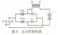 點(diǎn)火方式采用脈沖式點(diǎn)火,電路采用倍壓整流電路。圖5示出點(diǎn)火控制電路。全橋逆變器輸出的正向電壓先把VD2導(dǎo)通,給電容C2充電;輸出的負(fù)電壓把VD1導(dǎo)通,給C1充電。當(dāng)每個(gè)電容都充電到400V時(shí),可使800V的氣體放電管觸發(fā)導(dǎo)通,開(kāi)始放電。這樣,當(dāng)變壓器初級(jí)產(chǎn)生800V脈沖時(shí),次級(jí)就會(huì)產(chǎn)生上萬(wàn)伏的高壓脈沖,從而將高強(qiáng)度的氣體放電管雪崩擊穿。