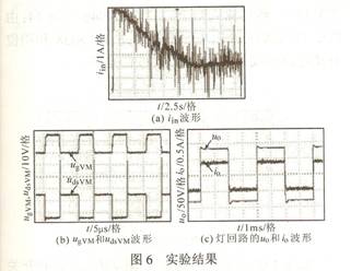 在前述原理分析和實(shí)現(xiàn)方案討論的基礎(chǔ)上進(jìn)行了實(shí)驗(yàn)論證。實(shí)驗(yàn)樣機(jī)是額定功率為35W汽車(chē)頭燈電子鎮(zhèn)流器。升壓電路采用反激式電路,選用UC3843作為PWM控制芯片。主要電路參數(shù)有:反激式電路的MOSFET開(kāi)關(guān)管選用的IRF540;二極管選用MUR860,變壓器的初級(jí)電感Lp=7.8µH,輸出電容選擇耐壓為630V的1µF的CBB電容。圖6b示出反激式變換器穩(wěn)態(tài)下開(kāi)關(guān)管的驅(qū)動(dòng)電壓UgVM和開(kāi)關(guān)管漏源極兩端的電壓UdsVM實(shí)驗(yàn)波形??梢?jiàn),UdsVM有一個(gè)很大的尖峰,是漏感的能量所致。圖6c示出穩(wěn)態(tài)時(shí)兩端的電壓uo及其流過(guò)燈的電流io實(shí)際工作波形。由圖可見(jiàn),燈兩端的輸出功率將近達(dá)35W,這與理論設(shè)計(jì)符合得很好。