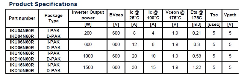 目前這種逆向?qū)ㄐ虸GBT有兩種封裝形勢(shì),一種是IPAK封裝,另外是DPAK封裝,電流有4安、6安、10安和15安四個(gè)等級(jí)。它主要的特點(diǎn)就是有非常低的價(jià)格,還有節(jié)省空間。半導(dǎo)體器件它的成本主要取決于兩個(gè)方面,一個(gè)是它的晶圓,減少晶圓的數(shù)量,從兩個(gè)晶圓減少到一個(gè)晶圓可以減少成本。另外的話,這種T0220的封裝還有這種D2PARK封裝可以減少成IPARK封裝和DPARK封裝,同時(shí)減少封裝的成本,減少了封裝的話同樣會(huì)減少它的空間,但是減少了晶圓的話會(huì)不會(huì)對(duì)它的性能造成影響?首先我們來(lái)看一下,同樣它有一個(gè)非常低的飽和導(dǎo)通壓降,對(duì)它的性能絲毫沒(méi)有任何影響。另外可以通過(guò)改變門(mén)級(jí)驅(qū)動(dòng)電阻,在寬范圍調(diào)節(jié)它的開(kāi)通和關(guān)斷的時(shí)間,有一個(gè)非常好的EMI效果,非常平滑的開(kāi)關(guān)波形,5us的短路保護(hù)能力,最高結(jié)溫可以達(dá)到175度。這個(gè)是這種逆向?qū)ㄐ虸GBT的主要參數(shù),這個(gè)是它的擊穿電壓,這個(gè)是它的電流,這是175度飽和導(dǎo)通壓降,這是開(kāi)關(guān)的能力,這是短路保護(hù)的能力,這是它的門(mén)級(jí)驅(qū)動(dòng)電壓,基本上對(duì)于一個(gè)200W的產(chǎn)品可以選擇4安的IGBT,600W的話可以選擇一個(gè)6安的,1000W可以選擇一個(gè)10安的,1500W的可以選擇15W的產(chǎn)品。