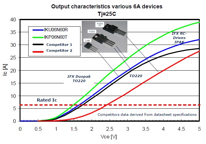 總結(jié)一下IGBT的重要特點(diǎn),一個(gè)是成本,因?yàn)樗捎玫氖且粋€(gè)晶圓,所以它的成本有很大的優(yōu)勢(shì);另外因?yàn)闇p少了它的封裝,可以給PCB留下更多的空間,進(jìn)一步提高產(chǎn)品的功率密度。同時(shí)它也有一個(gè)非常好的性能,非常低的飽和導(dǎo)通壓降,一個(gè)非常軟的開(kāi)關(guān)特性對(duì)EMI非常有幫助,它還有一個(gè)很好的溫度特性,最高溫度可以達(dá)到175度。藍(lán)色曲線是逆向?qū)ㄐ虸GBT和目前TO220封裝的飽和導(dǎo)通壓降的比較。這是用一個(gè)6安的產(chǎn)品在做比較,當(dāng)這個(gè)電流在6安的時(shí)候可以看到飽和導(dǎo)通壓降非常的低。