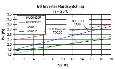 這個(gè)是25度損耗的時(shí)候,這個(gè)是175度損耗的時(shí)候,可以看到藍(lán)色的這根線,基本上它的損耗跟這個(gè)TO220封裝產(chǎn)品相差并不是很大。這個(gè)是在基于剛才基礎(chǔ)上做的一個(gè)損耗分析,首先頻率在4K赫茲的時(shí)候可以看到,這個(gè)淺藍(lán)色的就是二極管的開(kāi)關(guān)損耗,這個(gè)是二極管的導(dǎo)通損耗,這個(gè)是IGBT的開(kāi)關(guān)損耗,這個(gè)是IGBT的導(dǎo)通損耗??梢钥吹皆?K的情況下導(dǎo)通損耗這一部分和這一部分是占了絕對(duì)支配地位的。所以對(duì)于一個(gè)低頻應(yīng)用來(lái)說(shuō)減少它的飽和導(dǎo)通壓降對(duì)于IGBT是相當(dāng)?shù)闹匾?,?dāng)它的頻率升高的時(shí)候,它的開(kāi)關(guān)損耗就會(huì)稍微升高一點(diǎn)。