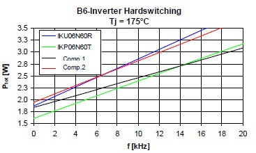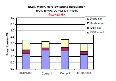 衡量一個(gè)IGBT的好壞有兩個(gè)非常重要的指標(biāo),一個(gè)就是它的飽和導(dǎo)通壓降,就是Vce(sat),另外一個(gè)就是開(kāi)關(guān)損耗,也就是Eoff。對(duì)于低頻的應(yīng)用來(lái)說(shuō),飽和導(dǎo)通壓降是占有絕對(duì)支配地位的,所以選擇這種RC-Drives的IGBT會(huì)是一個(gè)非常好的選擇,因?yàn)榭梢钥吹竭@種RC-Drives IGBT的飽和導(dǎo)通壓降是遠(yuǎn)遠(yuǎn)低于市面上的一些產(chǎn)品。這個(gè)是在一個(gè)無(wú)刷電機(jī)上面的損耗的分析。