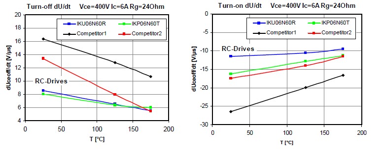 再加上不同的驅(qū)動(dòng)電阻,這個(gè)時(shí)候我們也對(duì)dV/dt進(jìn)行了一個(gè)測(cè)試,然后可以看到基本上我們的dV/dt都比我們的競(jìng)爭(zhēng)對(duì)手或者市面上的產(chǎn)品會(huì)優(yōu)異很多。因?yàn)闇p少I(mǎi)GBT的dV/dt的話可以減少前級(jí)的EMI濾波器的要求,同樣也可以減少成本,所以這個(gè)產(chǎn)品不僅在本身的價(jià)格上面有優(yōu)勢(shì),同樣也可以整體的減少系統(tǒng)的成本。
