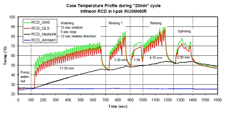 下面就是為了驗(yàn)證這種逆向?qū)ㄐ虸GBT在實(shí)際應(yīng)用當(dāng)中的一個(gè)表現(xiàn),我們?cè)谝粋€(gè)洗衣機(jī)上面驗(yàn)證了6安的IPARK的產(chǎn)品,在一個(gè)風(fēng)機(jī)上面我們驗(yàn)證了6安的DPARK的產(chǎn)品。這是一個(gè)實(shí)際的洗衣機(jī)的控制板,這種方式就是采用了夾子,然后把這個(gè)IGBT夾在散熱器上面。稍候我們會(huì)用這種IPARK的封裝對(duì)這種TO220的封裝做一些替代,然后比較一下他們的不同。就是說(shuō)我們把其中的一路替代成IPARK產(chǎn)品,然后做一個(gè)效率還有溫度的檢測(cè),通過(guò)這種熱電偶的方式來(lái)檢測(cè)它的表面溫度,來(lái)檢測(cè)它的結(jié)溫。因?yàn)樗饷嬗幸粋€(gè)夾子,我們沒(méi)有辦法用紅外相機(jī)來(lái)檢測(cè)它的溫度,所以我們采用了這種熱電偶的方式。這個(gè)是洗衣機(jī)的工作流程,首先的話是抽水,這個(gè)是洗滌,這個(gè)是漂洗,這個(gè)是甩干,整個(gè)20分鐘的流程當(dāng)中它的溫度的表現(xiàn),基本上它的最高溫度沒(méi)有超過(guò)90度,我們可以看到這個(gè)綠色和紅色有一點(diǎn)稍微小小的區(qū)別,這是因?yàn)樗纳岵灰粯?,IGBT的位置放在不一樣,所以會(huì)有一點(diǎn)不一樣,這個(gè)不用太過(guò)擔(dān)心。