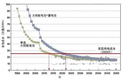 如同人們經(jīng)常指出的,太陽能發(fā)電確實也有缺點:下雨時輸出會很低,在陰天及其他情況時會有大幅波動,而且在夜晚時為零。然而,透過使用蓄電池后可以克服大部分的問題。如果配有蓄電池的太陽能發(fā)電系統(tǒng)達(dá)到與市電同價后,將會有很大的沖擊(其中包括減少石化燃料消耗)。日本經(jīng)濟(jì)產(chǎn)業(yè)研究所(RIETI)已預(yù)估大約2022年,配有蓄電池的家用太陽能發(fā)電系統(tǒng)將達(dá)到與市電同價(圖10)。