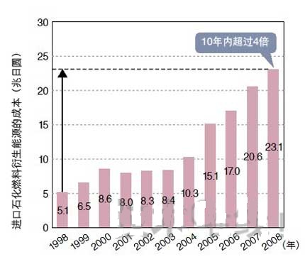 圖中顯示日本進(jìn)口的化石燃料衍生能源。圖由是AIST的櫻井和環(huán)境部依據(jù)金融貿(mào)易統(tǒng)計而制。
