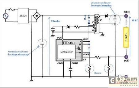 創(chuàng)意電子新近推出的TK5401就是這樣一款LED驅動電源IC,它具有不需要DC電源特性中所必須的電解電容的特性,使得LED壽命高達4萬小時以上。據介紹,TK5401封裝內置了高電壓功率MOS管及控制電路,因去除電解電容實現(xiàn)了小型化、低成本,并且實現(xiàn)了LED燈的長壽命和高效能。