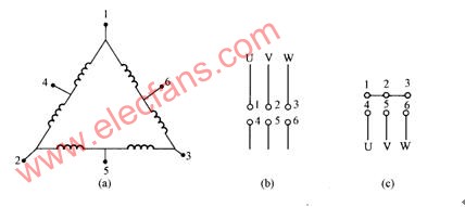 其中,(a)圖為結(jié)構(gòu)示意圖,改變接線方法可獲得兩種接法,(b)圖為三角形接法,磁極對(duì)數(shù)為2對(duì)極,同步轉(zhuǎn)速為1500r/min,是一種低速接法;(c)圖為雙星形接法,磁極對(duì)數(shù)為1對(duì)極,同步轉(zhuǎn)速為3000r/min,是一種高速接法。
