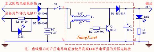 太陽能供電板的電路如圖1所示。由D1、BT構(gòu)成系統(tǒng)的太陽能充電電路。平時,只要達(dá)到一定光強(qiáng),太陽能電池板便通過二極管D1為充電電池BT充電,直至飽和。除了太陽能充電方式外,我還設(shè)計了備用的外部直流電源充電接口以防不時之需。外部充電電路由R1、DS1、D2、BT構(gòu)成,R1選用功率為1W的電阻,當(dāng)R1為10歐姆的時候,最佳外部充電電壓為3-4伏,DS1為外部充電指示燈,它是利用電阻R1上的壓降來點(diǎn)亮的。后面的升壓電路是運(yùn)用間歇振蕩器的快速關(guān)斷(截止)的特性而實現(xiàn)升壓的。S1為供電開關(guān),當(dāng)S1閉合后升壓電路開始工作,太陽能供電板便可驅(qū)動負(fù)載,J1為輸出接口,DS2是輸出指示燈。