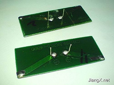 首先剪一小段金屬絲焊接在太陽能電池板的兩個電極上作為引腳(圖3),以便于連接和固定在電路板上。兩塊太陽能電池板是正極對正極,負(fù)極對負(fù)極(上面有標(biāo)識)并聯(lián)起來使用的,這樣可以有效地增強(qiáng)太陽能電池板提供電流的能力。安裝好太陽能電池板后如圖4所示。