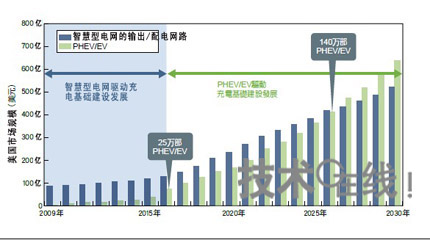 美國的充電基礎(chǔ)設(shè)施一開始將慢慢地隨著智能電網(wǎng)市場成長,而非PHEV/EV市場。智能電網(wǎng)的傳輸和分配網(wǎng)路升級的市場規(guī)模預(yù)估是依Morgan Stanley的資料製成。PHEV//EV市場規(guī)模是依據(jù)EPRI市場滲透率來預(yù)估,以每臺30000美元換算。
