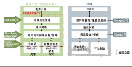 IT產(chǎn)業(yè)和智能電網(wǎng)能源產(chǎn)業(yè)在處理數(shù)據(jù)上展現(xiàn)了結(jié)構(gòu)上的相似性。美國新興公司希望將Google和Cisco在IT的成功模式沿用在充電基礎(chǔ)設(shè)施中。