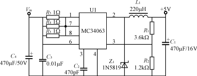 如果保證在最低輸入電壓70%Rn時電表能輸出正常的工作電壓,按線性變壓器特性,則在額定輸入電壓Un時,輸出電壓會較高,如果輸出電壓整流濾波后采用一般的線性穩(wěn)壓器供電,將會使整機(jī)功耗加大;而在最高輸入電壓時,將會使變壓器溫升增大,線性穩(wěn)壓電路損耗加大,發(fā)熱量也會增大;針對整機(jī)耗電較大的電子電度表,其解決辦法一是可以采用較好材質(zhì)的硅鋼片,如Z11型硅鋼片;二是低壓輸出穩(wěn)壓電路采用一個低成本的高效率DC/DC變換電路,即可使整機(jī)功耗顯著降低,還可在寬輸入電壓范圍內(nèi),穩(wěn)定、高效地工作。這些DC/DC電路可以采用簡單的低成本MC34063、LM2574等DC/DC變換器,采用MC34063設(shè)計的+5V輸出DC/DC變換器如圖3所示。