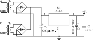三相電度表有三相三線,三相四線,輸入電壓有3×(220~240)V/380~400V、3×57V/100V等。三相電度表供電電路可以參考單相電度表電源的設(shè)計方法,對于三相四線供電電路,可以在每一相線對零線之間接1只線性變壓器,共3只線性變壓器;對三相三線可以取一相如Β相作為公共地線,A、C相對Β相接2只線性變壓器。這些變壓的副邊單獨整流后再將輸出的正極接在一起、負(fù)極接在一起,經(jīng)電容濾波后,再通過DC/DC變換器輸出穩(wěn)定電壓,向電度表供電,如圖5所示。