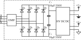 這種供電方式體積和重量較大,成本也較高,顯然按以上電路連接時,對三相四線供電時不能缺零線,對三相三線供電時不能缺公共地線,如B相;另外,有的供電局用戶要求,三相電度表輸入端任意兩線有電壓輸入時都能工作,則圖5的設(shè)計便不能達(dá)到目的;當(dāng)采用三相電度表專用開關(guān)電源模塊供電時,可解決以上問題,其內(nèi)部結(jié)構(gòu)圖如圖6所示。