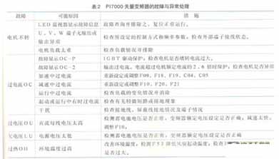 (5)上述調(diào)試試驗(yàn)如有異常,立即查找原因并排除故障PI7000矢量變頻器的故障與異常處理,可見(jiàn)表2