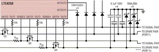 要改變每個(gè)通道的其它兩個(gè)元件,以處理額外的電流。典型情況下,MOSFETQ4要用較大的器件取代,以在電流限制期間承受更大的功率。在這種應(yīng)用中,采用D2PAK封裝的IRF530類(lèi)器件就足夠了。此外,也要指定PoE數(shù)據(jù)磁性模塊以承載更高的電流。幾家磁性元件供應(yīng)商最近推出了具有足夠電流能力的器件。