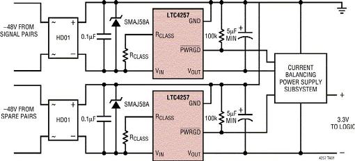 四對(duì)PD電路是最大的變化(圖4b)?,F(xiàn)在需要采用兩個(gè)LTC4257器件,電源電路必須具備足夠的智能,以便把從每一個(gè)通道吸取的電流限制在802.3af規(guī)范容許的范圍之內(nèi)。要做到這一點(diǎn),就要平衡從每一對(duì)線(xiàn)吸取的電流或平衡從每一對(duì)線(xiàn)吸取的功率,直到它接近(但是不超過(guò))ICUT極限,然后,才從其它線(xiàn)對(duì)吸取電流。這種電路可能相當(dāng)復(fù)雜,不同的設(shè)計(jì)之間差異也很大。