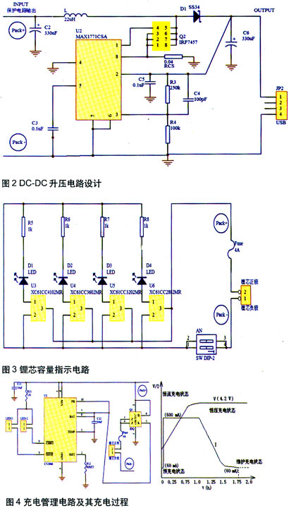本文論述的電路系統(tǒng)設(shè)計由五部分組成:鋰芯容量指示電路、電芯保護(hù)電路、充電管理電路、DC-DC升壓電路和功能擴展電路。鋰芯容量指示電路由XC61CC系列的電壓監(jiān)控芯片組成。電芯保護(hù)電路由過充保護(hù)、過放保護(hù)、過溫保護(hù)三部分組成,HAT2027、R5402、自恢復(fù)保險絲構(gòu)建了三重保護(hù),使鋰芯安全性大大增強。充電管理電路采用了CN3066,將充電過程分為涓流充電、恒流充電、恒壓充電和維護(hù)充電四個部分,使移動隨身電源能夠最大程度地儲備能量。DC-DC升壓電路采用了MAX1771集成芯片,可將鋰芯容量在安全范圍內(nèi)最大限度釋放,達(dá)到對多種數(shù)碼設(shè)備供電的目的。功能擴展涵蓋了戶外活動所涉及的常見需求,具有應(yīng)急夜間高亮照、戶外防盜安全警報、野營驅(qū)蚊等功能。