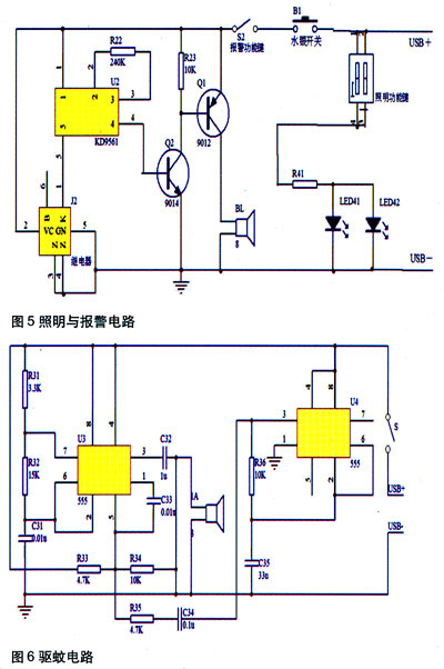 如圖5所示,當(dāng)按下預(yù)報警功能鍵時,USB輸出電壓加載在報警系統(tǒng)上,此時移動隨身電源處于"預(yù)報警"狀態(tài)。當(dāng)水銀開關(guān)B1位置偏移正常的斷開位置,將觸發(fā)繼電器工作,使KD9561音樂片工作,發(fā)出報警響聲,提醒注意安全。