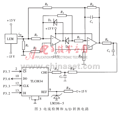 軟起動的主要任務是控制主電路的電流,因此要對電流進行檢測和監(jiān)控。電流檢測和A/D轉換電路如圖3所示。本裝置采用LEM電流傳感器進行主回路電流的檢測,其主要優(yōu)點是LEM電流傳感器可以測量任意波形的電流及瞬態(tài)峰值,副邊電流能真實地反映原邊電流的波形,原邊電路與副邊電路之間完全絕緣,可靠性高,而且動態(tài)性能好,精度高,因此能夠很好地滿足工業(yè)現(xiàn)場應用的需要。為減小誤差保證轉換精度,沒有采用傳統(tǒng)的橋式二極管整流電路對LEM模塊輸出的電流進行整流,而是采用由2個運放組成的精密全波整流電路進行整流并濾波,得到與交流電流成比例變化的0~5V的直流電壓信號送入A/D轉換器TLC0834轉換成二進制數(shù)送入單片機,以此信號作為改變晶閘管觸發(fā)角大小的依據(jù),并用于數(shù)碼管顯示。TLC0834是8位串行控制模數(shù)轉換器,以5V作為基準電壓,通過與控制處理器相連的串行數(shù)據(jù)鏈路傳送控制命令,用軟件對通道選擇和輸入端進行配置。多路器尋址通過TLC0834的DI端移入轉換器。TLC0834的DI、CLK、DO和/CS分別與單片機的P3.2、P3.3、P3.6和P3.7端口連接。程序中置/CS為低,使TLC0834能夠工作,并對轉換器初始化;然后從處理器接收1個時鐘,在每個時鐘的上升跳變時,DI端的數(shù)據(jù)移入多路器地址移位寄存器。在轉換過程中,轉換數(shù)據(jù)同時從DO端輸出。這樣TLC0834將輸入電壓轉換成二進制數(shù)送入單片機后進行處理和顯示。