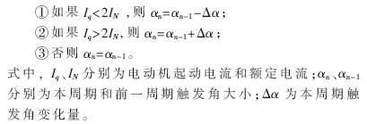(3)軟起動模塊:根據(jù)電動機電流檢測信號,經(jīng)單片機分析和處理后得到當前晶閘管觸發(fā)角的大小,以實現(xiàn)電機的限流起動。以起動電流限定為2倍的額定電流為例,觸發(fā)角控制算法如下: