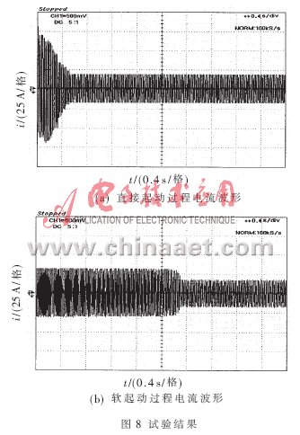 圖8為電機起動過程實測電流波形,圖8(a)為直接起動過程電流波形,圖8(b)為軟起動過程電流波形。可見整個軟起動過程中電流的變化很平穩(wěn),沒有出現(xiàn)振蕩現(xiàn)象,電機軟起動時的起動電流是其穩(wěn)定運行電流的2倍左右,而直接起動非常迅速,啟動電流很大,直接起動時的起動電流是其穩(wěn)定運行電流的5~7倍。試驗結果表明,所設計的軟起動器系統(tǒng)效果良好,起動過程平穩(wěn),無沖擊和振蕩。