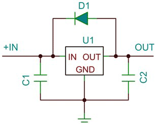 另一個(gè)動(dòng)態(tài)性能變量是輸出噪聲。通過(guò)增加穩(wěn)壓器輸出端的濾波器電容一般可以降低輸入紋波和輸出噪聲,但是會(huì)延長(zhǎng)瞬態(tài)恢復(fù)時(shí)間。線性穩(wěn)壓器的運(yùn)行依賴于一個(gè)內(nèi)部增益級(jí)。為了防止該增益級(jí)出現(xiàn)振蕩,通常會(huì)需要一個(gè)最小輸出濾波器電容(請(qǐng)參見圖1中的C2)。一個(gè)輸入濾波器電容(請(qǐng)參見圖1中的C1)將有助于穩(wěn)壓器服務(wù)于瞬態(tài)負(fù)載,尤其是在穩(wěn)壓器遠(yuǎn)離電源時(shí)更需要這樣一個(gè)輸入濾波器電容。許多穩(wěn)壓器都不容許存在反向電壓。如果輸出電容被充電至輸出電壓,同時(shí)輸入短路至接地,那么穩(wěn)壓器將出現(xiàn)反向電壓,并且在所有電路獲得放電以前穩(wěn)壓器都會(huì)鎖閉在某種未知狀態(tài)中。這種故障狀態(tài)可能會(huì)引起穩(wěn)壓器自毀。為了避免出現(xiàn)這種故障模式,可能會(huì)需要一個(gè)反向二極管鉗位(請(qǐng)參見圖3)。