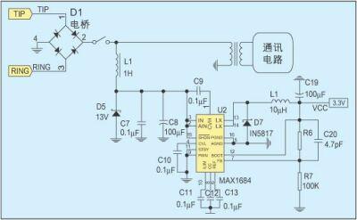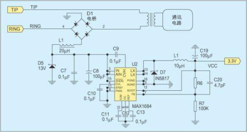摘機(jī)饋電電路大致分為兩類,饋電電路與通訊電路并聯(lián)的屬于并聯(lián)饋電,饋電電路與通訊電路串聯(lián)的屬于串聯(lián)饋電。圖2是一種常用的并聯(lián)饋電電路,大電感L1保證直流饋電不會影響交流信號。對于惡劣的線路狀況,如5km長的用戶線路,若不考慮通訊電路的影響,齊納管D5上的電壓最大為15V,功率可達(dá)340mW。當(dāng)線路狀況更加惡劣時(shí),將齊納管D5上的電壓降低到13V,則可獲得300mW左右的功率。利用MAXIM公司的開關(guān)頻率為600KHz,效率可達(dá)95%的高效DC/DC轉(zhuǎn)換器MAX1685,將這個電壓轉(zhuǎn)換成3.3V就可獲得85mA的電源電流。